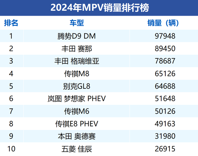 从品牌上来看,丰田的地位依旧稳固,凭借赛那和格瑞维亚两款“姊妹车”,占据了榜单第一、第四的位置,两款车合计年销量超16万台,这也再次验证了丰田“双车战略”的成功。
