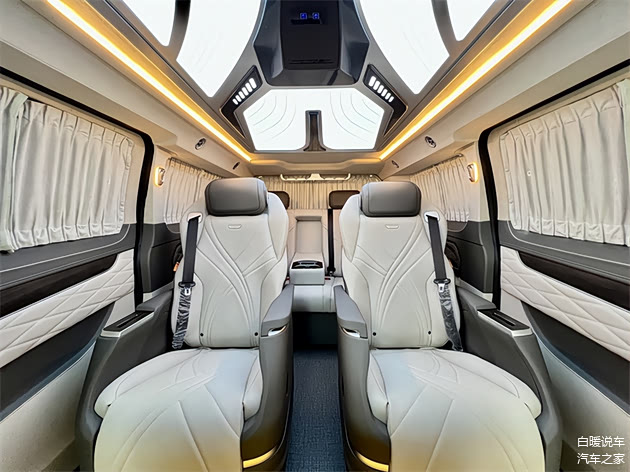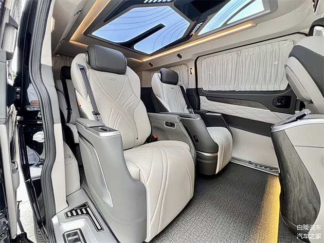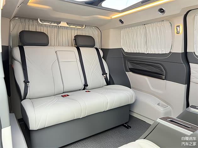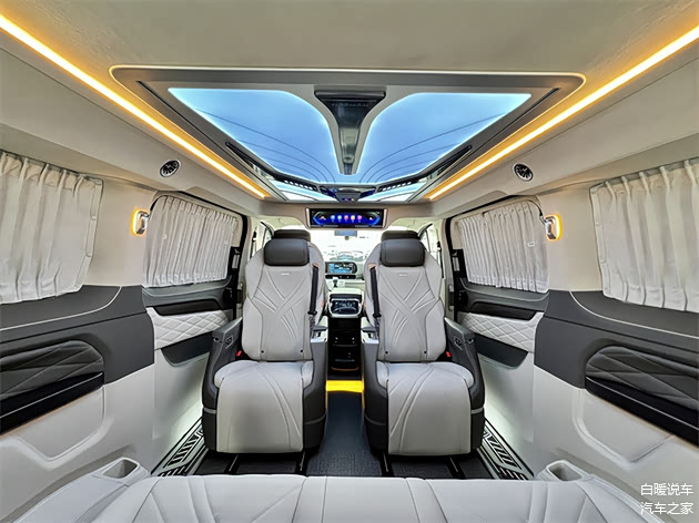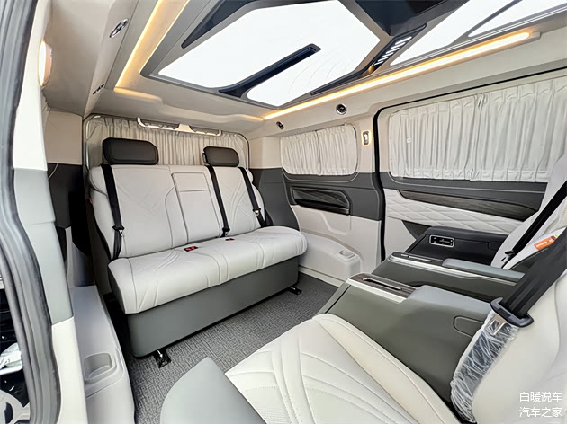 打开双侧电动防夹滑门,映入眼帘的是5门7座的豪华座舱。内饰采用NAPPA皮质包覆,搭配桃木装饰,质感出众。2-2-3座椅布局,第二排配备WOWSEN航空座椅,支持八项主动调节+旋转功能,并带有电动腿托、六点位智能气动按摩,堪称"陆地头等舱"。第三排座椅支持电动调节和一键放倒,可形成平整的沙发床空间。全车多处无线充电、温控智能车载冰箱、独立分区空调,以及双12.3寸高配液晶一体屏、24寸二排多媒体影音大屏,将科技与豪华完美融合。