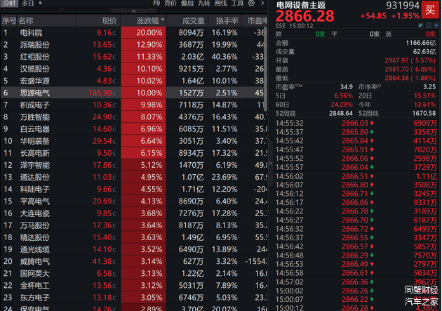 电网设备主题指数(931994.CSI)1月16日收涨1.95%,盘中最高触及2981.70点,创2014年6月30日基日以来最高记录。80只成分股(涵盖特高压产业、智能电网建设)当日有61只收涨,其中电科院20cm涨停,汉缆股份、宏盛华源、思源电气、积成电子10CM涨停,派瑞股份涨12.90%、红相股份股份涨11.33%。