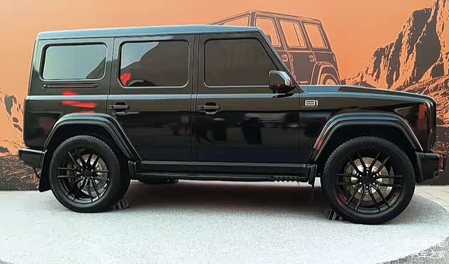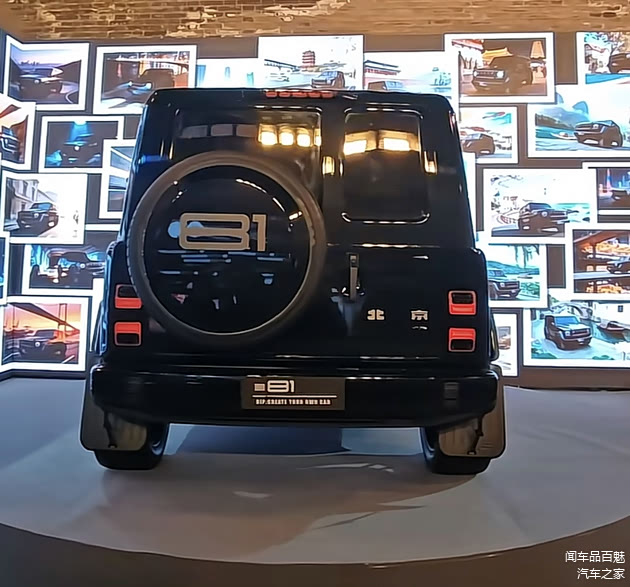 车身侧面,硬朗且魁梧的标准化“方盒子”结构中,除了依然会在前翼子板上嵌入“81”标识以外,它还有着镂空多幅式大尺寸轮毂,用以进一步提升辨识度,并为其侧颜注入性能画风。另外,参考其方正、魁梧的身形姿态;预计其之后的量产版本车长大概率会超过5米。