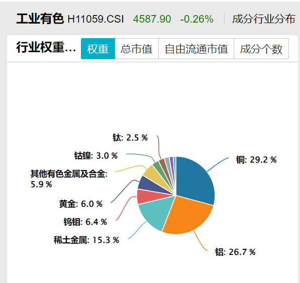 工业有色ETF(560860)的前三大金属行业为铜(29.2%)、铝(26.7%)、稀土(15.3%),合计占比近70%。前十大成分股涵盖洛阳钼业、北方稀土、中国铝业、江西铜业等行业龙头。