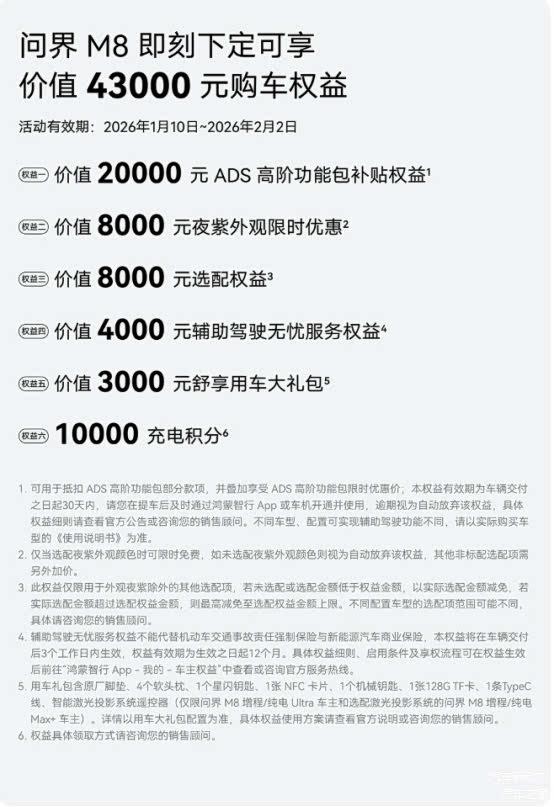 岁末年初,春节返乡的脚步愈发临近,一辆兼具安全、舒适与智能的座驾,成为无数家庭的刚需。正值年末购车旺季,问界M8为计划购车的家庭送上重磅惊喜。即日起至2026年2月2日,下定问界M8即可享受价值43000元的购车权益,涵盖价值20000元的ADS高阶功能包补贴、价值8000元的夜紫外观限时优惠、8000元选配权益、4000元辅助驾驶无忧服务权益、3000元舒享用车大礼包,以及10000充电积分,年末购车正当时。