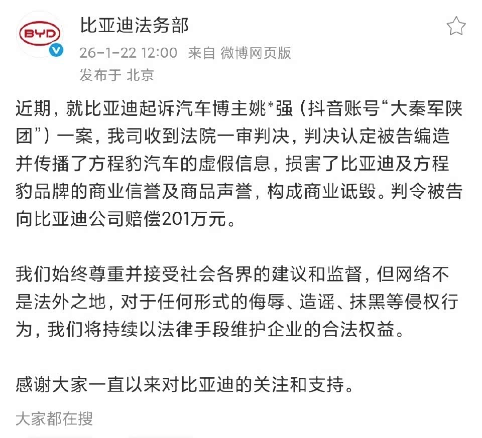 比亚迪起诉汽车博主