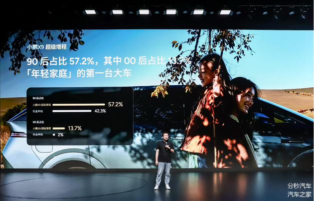 从用户结构来看,小鹏X9呈现出明显的年轻化趋势。90后用户占比达57.2%,00后占比13.7%,整体购车年龄比传统MPV用户平均年轻约10岁。同时,女性车主占比达到22%,首购用户比例达21%,接近行业平均水平的两倍,表明其已成为不少年轻家庭的“第一台MPV”。此外,约八成增换购用户来自豪华品牌阵营,BBA车主占比较高,反映出其在高端用户群体中的认可度。