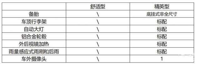 精英型多一个底挂式非全尺寸备胎,除了燃油版的舒适型,其他三款均标配车顶行李架和铝合金轮毂、自动大灯、外后视镜加热、雨量感应式雨刷和后雨刷有一个车外摄像头