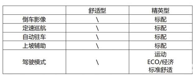 在操作配置上精英型增加了倒车影像、定速巡航、自动驻车和上坡辅助;驾驶模式有运动、ECO/经济、标准舒适三种可选。