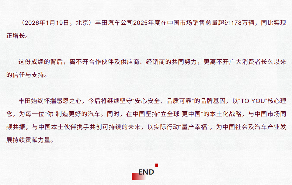 丰田汽车公司2025年度在中国市场销售总量超过178万辆,同比实现正增长。