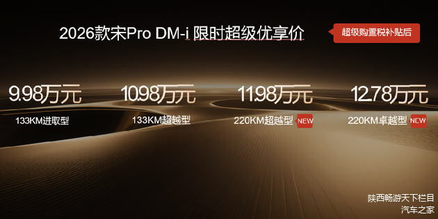 2026款宋Pro DM-i则聚焦“全家舒享”,在原有大空间基础上,优化底盘调校与座舱静谧性,并可选装智能冷暖冰箱、座椅按摩等配置,满足家庭用户对舒适出行的更高要求。