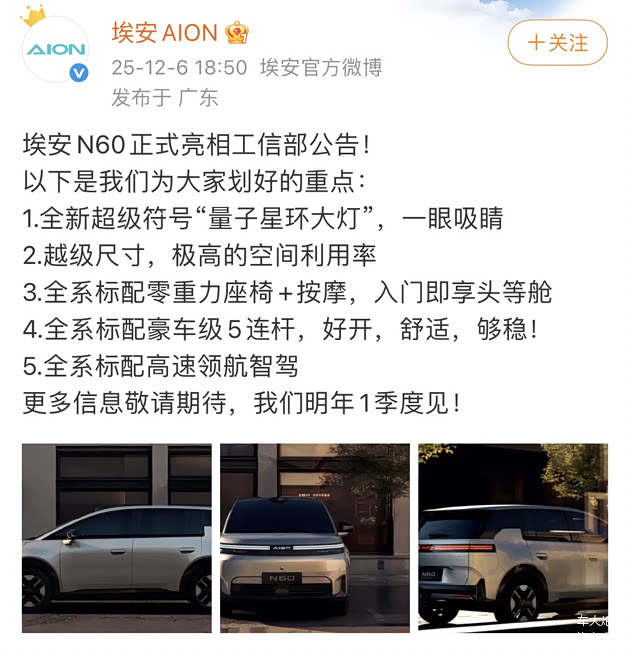 作为广汽集团旗下的新能源品牌,当前广汽埃安深耕纯电紧凑型SUV细分市场,相继投放了埃安AION Y(官方指导价:9.98万元起)、埃安AION V(官方指导价:10.98万元起)、埃安AION i60纯电版(官方指导价:10.98万元起)。从目前的信息来看,埃安AION N60入门即拥有丰富的高价值配置,但动力和续航能力不算突出。那么作为后来者,您觉得埃安AION N60定价多少能在竞争激烈的市场中占据一席之地呢?欢迎留言评论。