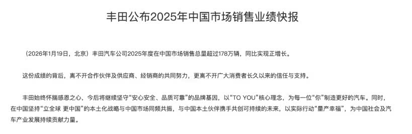 丰田汽车2025年在华销量达178.04万辆,实现同比0.2%的微增,终结了此前连续四年的下滑趋势,成为日系品牌中唯一逆势增长的车企。