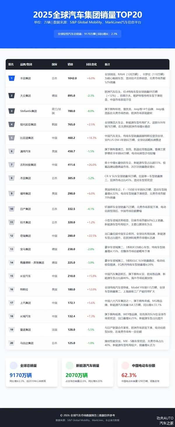 目前尽管还有相当部分汽车集团尚未披露2025全年全球最终交付,但从已公开的交付数据与主流数据库统计看,丰田、大众、现代起亚位居全球前三基本无悬念。