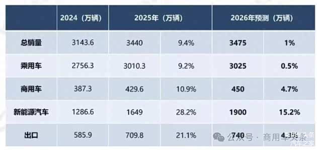 1月14日,中国汽车工业协会预计2026年中国汽车总销量3475万辆,同比增长1%。其中乘用车销量预计达到3025万辆,同比增长0.5%,商用车销量预计达到450万辆,同比增长4.7%。新能源汽车销量有望达到1900万辆,同比增长15.2%,汽车出口预计达到740万辆,同比增长4.3%。