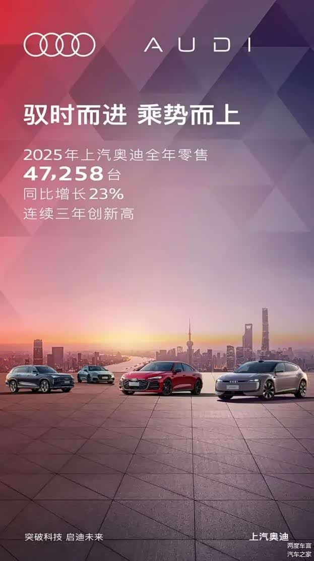 这份集权威认证、诚意权益与优质服务于一体的价值,早已在市场数据中得到了有力印证。2025年,上汽奥迪全年零售47,258辆,同比增长23%,其中 奥迪E5 Sportback累计销量6,650辆,月度销量持续稳健环比增长。如今“中国年度车”大奖的加冕,更巩固了其市场地位。对于新春焕新的消费者而言,选择奥迪 E5 Sportback,不仅是选择一款豪华电动车,更是选择一份行业权威检验的品质、实实在在的购车权益,以及一段全程无忧的高端出行体验。