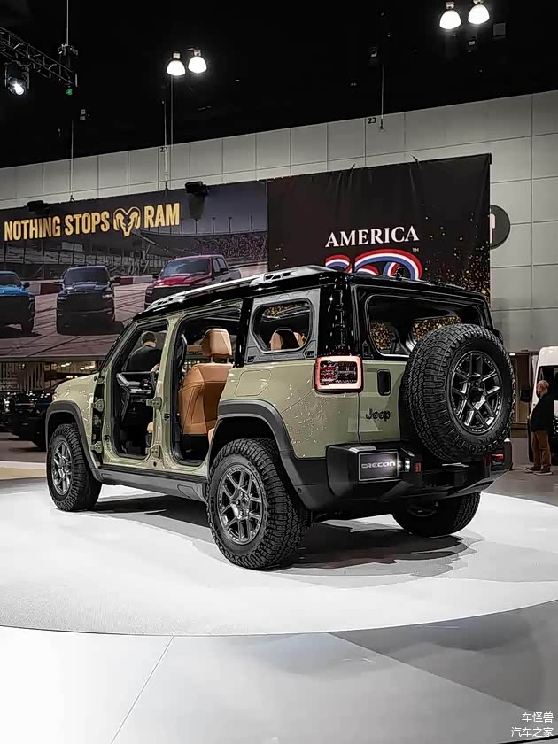 外观延续家族标志性硬派风格,前脸经典七孔式中网搭配环状 LED 灯带,每个中网槽口都内置发光装置,点亮后气场拉满且辨识度极高。立体式前包围搭配醒目红色拖车钩,直白彰显越野属性。车身侧面线条平直利落,粗壮的越野轮胎进一步强化硬派气质,最具玩乐感的是车门与侧窗可无工具拆卸,还能选装 Sky One-Touch 电动敞篷顶,天气晴好时开启敞篷,尽享户外驾驶乐趣。车尾设计简约大气,小巧尾灯组搭配外置全尺寸备胎,复古又有辨识度。Moab 版本专属配备 33 英寸越野胎,超大接近角与离去角大幅提升通过性,复杂路况也能从容应对。