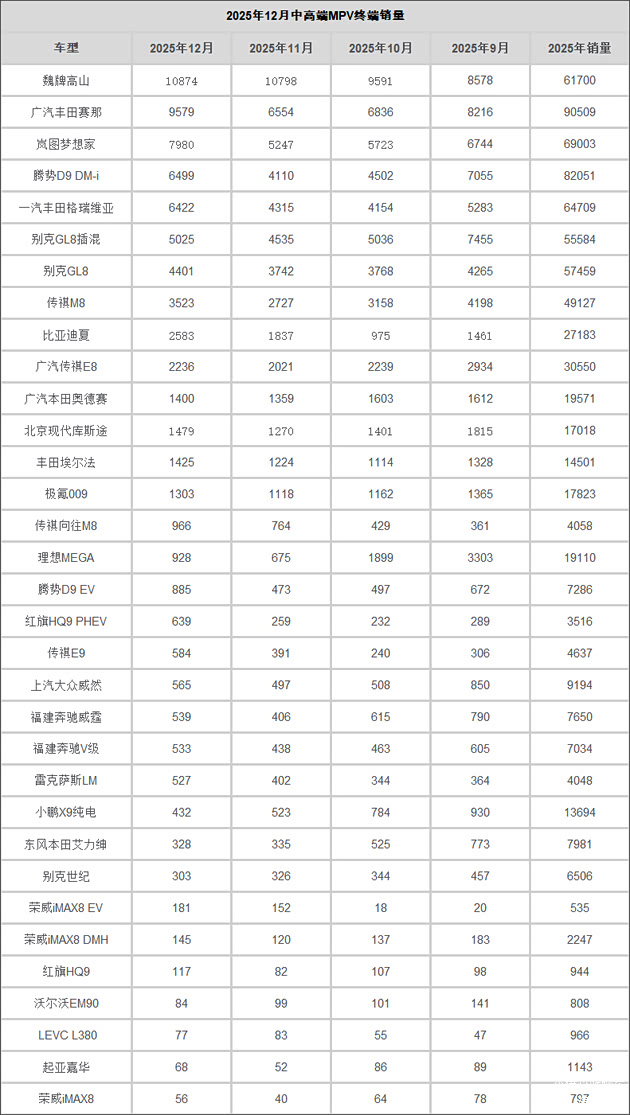 在2025年12月,魏牌高山售出10874辆,是中高端MPV市场的销量领跑者,全年销量61700辆,也是一个不错成绩。价格不贵、空间够大,动力表现也可以让人满意,是高山获得青睐的重要原因。 岚图梦想家同样表现不俗,12月终端销量7980辆,全年销量69003辆。另一款自主品牌热门新能源MPV腾势D9 DM-i的12月销量为6499辆,全年销量82051辆,虽然在总销量方面表现更优,但其在下半年销量走势一般。