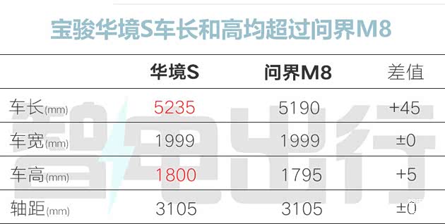 俩车都是2+2+2六座,尺寸上它比问界M8大,车长多45mm,高5mm,轴距都是3105mm。