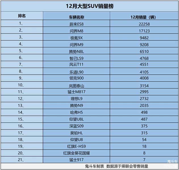 结果发现,榜单上,只有两款大型SUV在12月零售销量过万,不少车型是有声量没销量。接下来,看看榜单具体排名与销量表现。榜单上,排名第一位的车型是 蔚来ES8,12月零售销量达到22258辆,这款车型换新上市后,价格与产品力进行了双双调整,性价比上凸显出新的优势,销量冲到榜首位置。