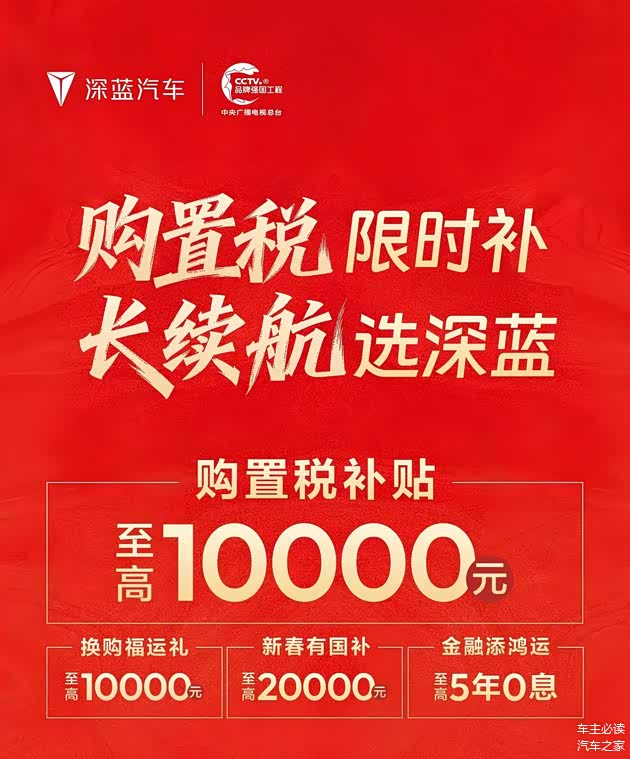 1月20日,深蓝汽车官方推出“购置税限时补长续航选深蓝”购车福利,针对旗下多款车型推出至高购置税补贴10000元限时政策,并提供至高10000元换购礼、至高20000元国补礼以及至高5年0息金融礼。