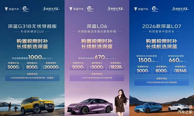 其中, 深蓝G318无忧穿越版可享受5000元购置税补贴、8000元换购福运礼、至高20000元国补红包以及15万5年贷3年0息或20万5年贷3年0息(秘境版);深蓝L06部分车型可享受5000元购置税补贴、至高5000元换购礼、至高18228元国补礼、享10万5年贷3年0息或8万2年贷0息;2026款深蓝L07可享受5000元购置税补贴、8000元置换礼、至高18348元国补以及享10万5年贷3年0息或8万2年贷0息。