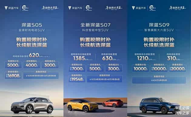 除此之外,深蓝S05 520Plus版可享限时一口价10.89万,除520Plus版之外配置可享5000元购置税补贴、4000元置换礼、3000元换购礼、至高16908元国补红包以及享10万5年贷3年0息或8万2年贷0息;深蓝S07可享至高7000元购置税补贴、5000元置换礼、3000元换购礼、至高19548元国补红包以及享10万5年贷3年0息或8万2年贷0息;深蓝S09可享10000元购置税补贴、至高10000元换购礼、至高20000元国补红包以及至高20万5年贷0息。
