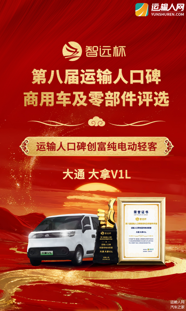2026年1月16日,运输人网主办的第八届“智远杯”运输人口碑商用车及零部件评选线上颁奖活动隆重举行,大通大拿V1L荣获“运输人口碑创富纯电动轻客”奖项。