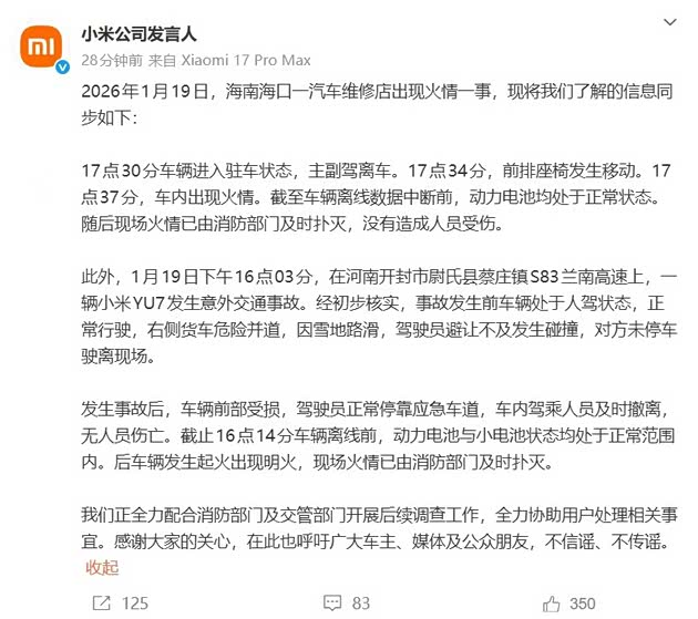 1月20日,小米公司发言人发微博回应了1月19日两起小米汽车起火事故。据介绍,其中一起起火事故发生在海口市一汽车维修店内,小米公司发言人称“截至车辆离线数据中断前,动力电池均处于正常状态。随后现场火情已由消防部门及时扑灭,没有造成人员受伤。”另一起起火事故发生在河南开封,“事故发生前车辆处于人驾状态,正常行驶,右侧货车危险并道,因雪地路滑,驾驶员避让不及发生碰撞,对方未停车驶离现场。发生事故后,车辆前部受损,驾驶员正常停靠应急车道,车内驾乘人员及时撤离,无人员伤亡。截止16点14分车辆离线前,动力电池与小电池状态均处于正常范围内。后车辆发生起火出现明火,现场火情已由消防部门及时扑灭。”小米公司发言人呼吁广大车主、媒体及公众朋友,不信谣、不传谣。
