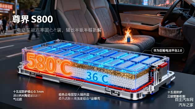 2026年1月14日,重庆街头一辆 尊界S800的后排扶手箱位置突发冒烟并出现明火,现场人员迅速扑灭火情。事件引发公众关注后,鸿蒙智行于1月19日发布官方声明,引用当地消防部门的调查结论:起火原因为掉落在后排座椅下方的打火机受挤压导致,排除车辆自身质量问题。在外界聚焦事件真相的同时,一个疑问也浮出水面——为何外部火源未能引发电池包燃烧,甚至没有波及整车安全?答案藏在尊界S800搭载的华为巨鲸电池平台2.0的十五层防护设计中。