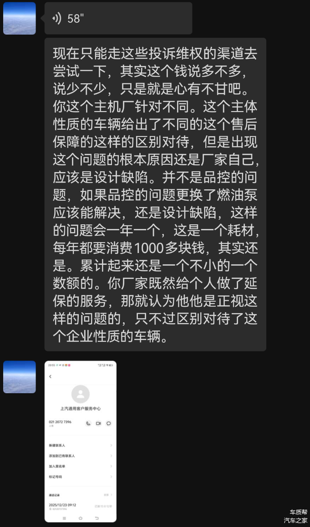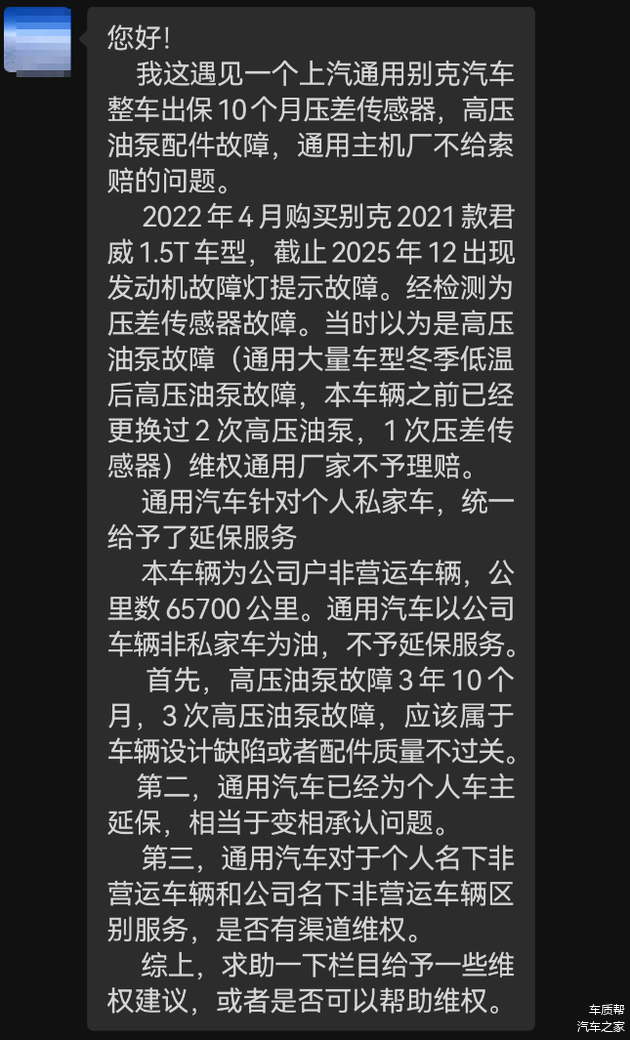 张先生对此提出三大质疑:其一,车辆购买3年10个月内三次出现高压油泵相关故障,足以说明该部件存在设计缺陷或质量不过关,而非普通品控问题,若为品控问题,更换配件后应能解决,而非呈现“一年一故障”的耗材化特征;其二,上汽通用为个人车主推出延保服务,相当于变相承认了高压油泵相关故障的普遍性和产品问题,却对同样是非营运性质的公司户车辆区别对待;其三,厂家针对个人与公司名下非营运车辆实施差异化售后保障服务,缺乏合理依据,损害了公司户车主的合法权益。