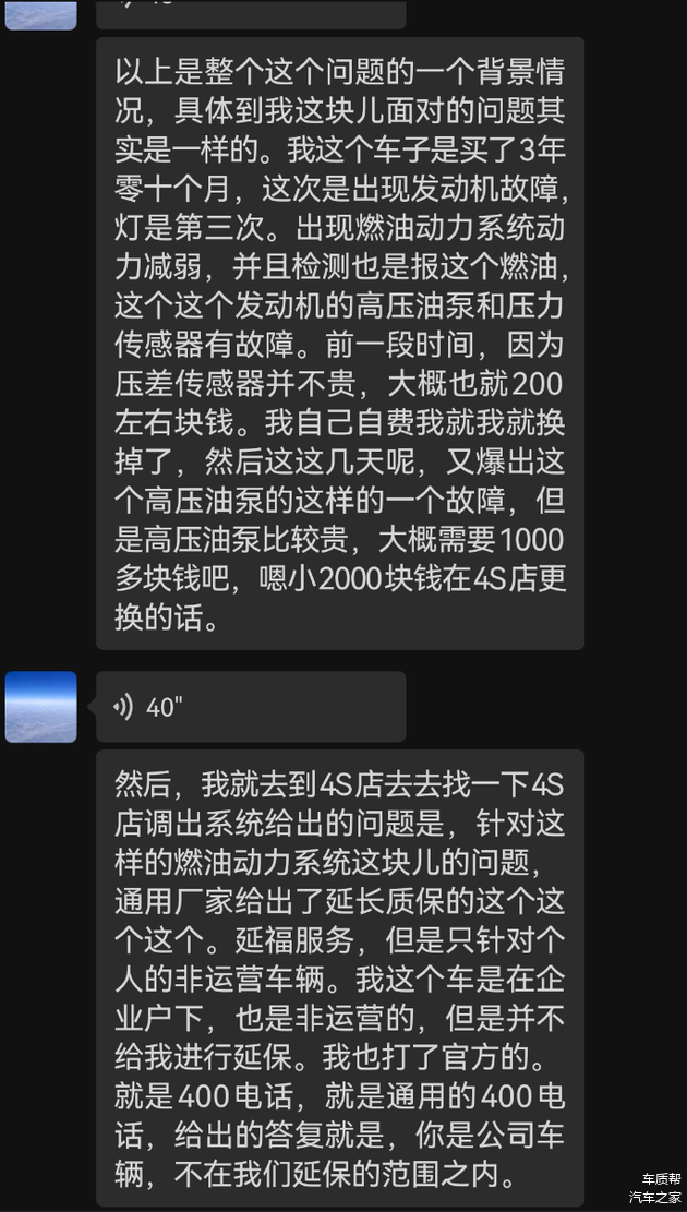 张先生表示,因压差传感器价格较低(约200元),他已自行自费更换,但高压油泵更换费用较高,在4S店更换需近2000元,遂向4S店寻求解决方案。4S店查询系统后告知,针对此类燃油动力系统问题,上汽通用厂家已推出延长质保服务,但该服务仅覆盖个人名下非营运车辆,张先生的企业户非营运车辆,不在延保范围内。