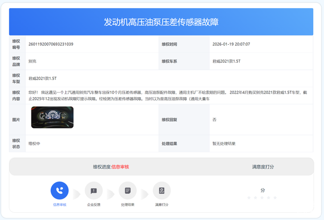 据张先生描述,其于2022年4月购买别克2021款君威1.5T车型,车辆登记在企业名下,属于非营运性质,截至故障发生时行驶里程为65700公里。2025年12月,车辆发动机故障灯亮起,经检测为压差传感器故障,后续又爆出高压油泵故障,这已是该车第三次出现燃油动力系统相关故障,此前曾先后两次更换高压油泵、一次更换压差传感器。