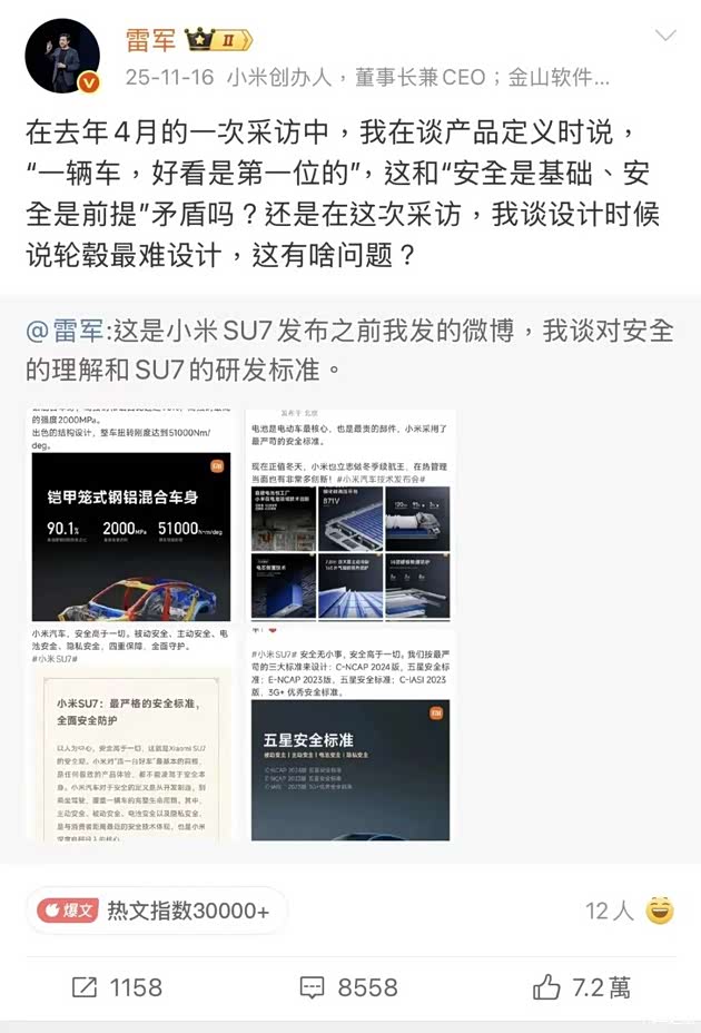 ▲ 去年11月,雷军发微博强调颜值与安全不冲突。图 / 微博截图