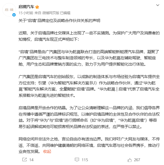 声明指出,启境品牌由广汽集团与华为乾崑联合打造,定位高端智能新能源汽车品牌,融合了广汽在三电技术与整车制造领域的积累,以及华为乾崑在辅助驾驶、智能座舱等方面的技术实力。