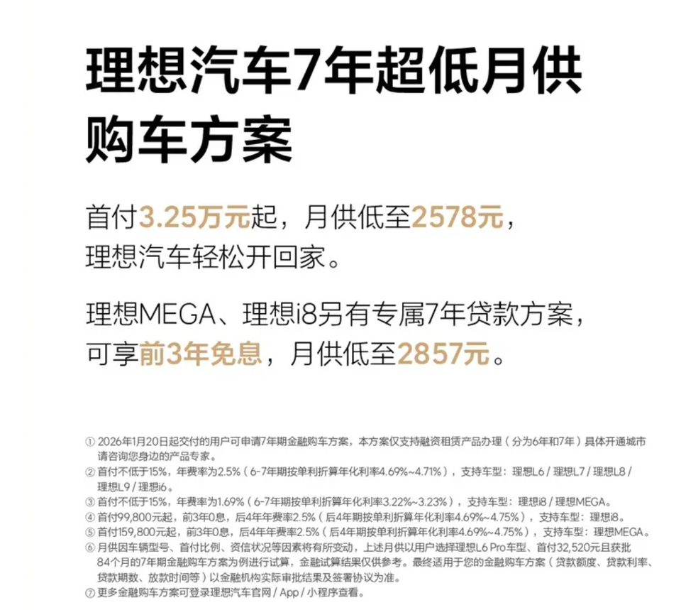 -理想推7年超低月供购车方案,首付3.25万元起,月供最低2578元,理想MEGA、理想i8有专属7年贷款方案,购车压力更小,7年满满还呗。