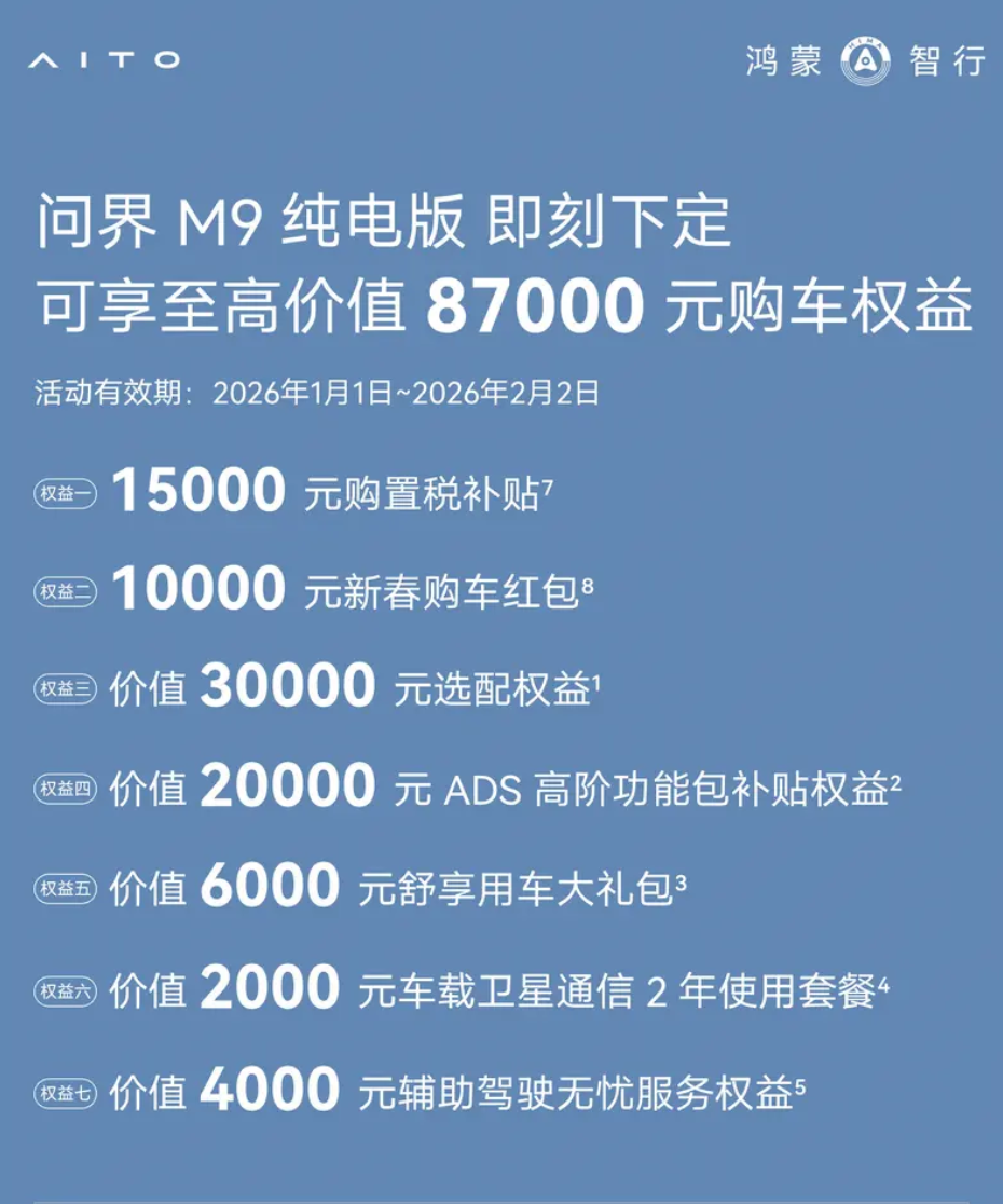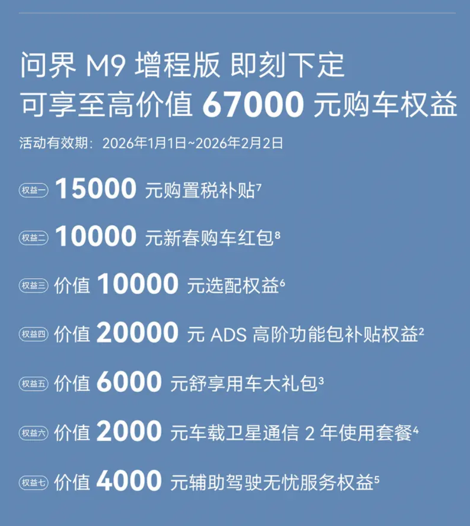 -2月2日前,买问界M9纯电送至高8.7万购车权益,买问界M9增程送至高6.7万购车权益,详细送的东西,便宜了哪些,给大家上图了,这力度应该是目前最大的了。