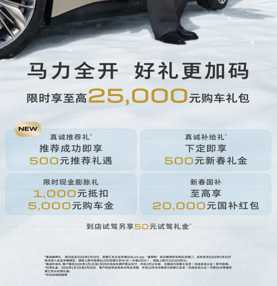 -别克至境L7推出新春限时礼遇,限时至高2.5万购车礼包,时间限制到2月28日前,给了大家充足的考虑时间,到店试驾有50元礼金。