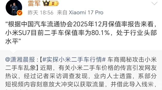 这款曾因订单火爆造就了汽车圈“硬通货”神话的小米SU7,在即将换代之际,出现了二手车价格跳水的争议。强烈的反差,推动了巨大的网络热度。在社交平台,雷军也在直播中直面保值率争议,称“处于行业头部水平”。