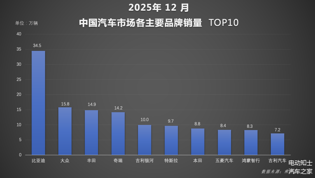 从全年表现来看,2025年比亚迪集团累计销售460.24万辆,再次刷新年销量纪录,连续蝉联中国汽车市场车企销量冠军、中国汽车市场品牌销量冠军以及全球新能源车市场销量冠军。在刚刚过去的12月,比亚迪完成第1500万辆新能源汽车下线,成为首家达成这一里程碑的中国车企,为2025年书写里程碑式意义。