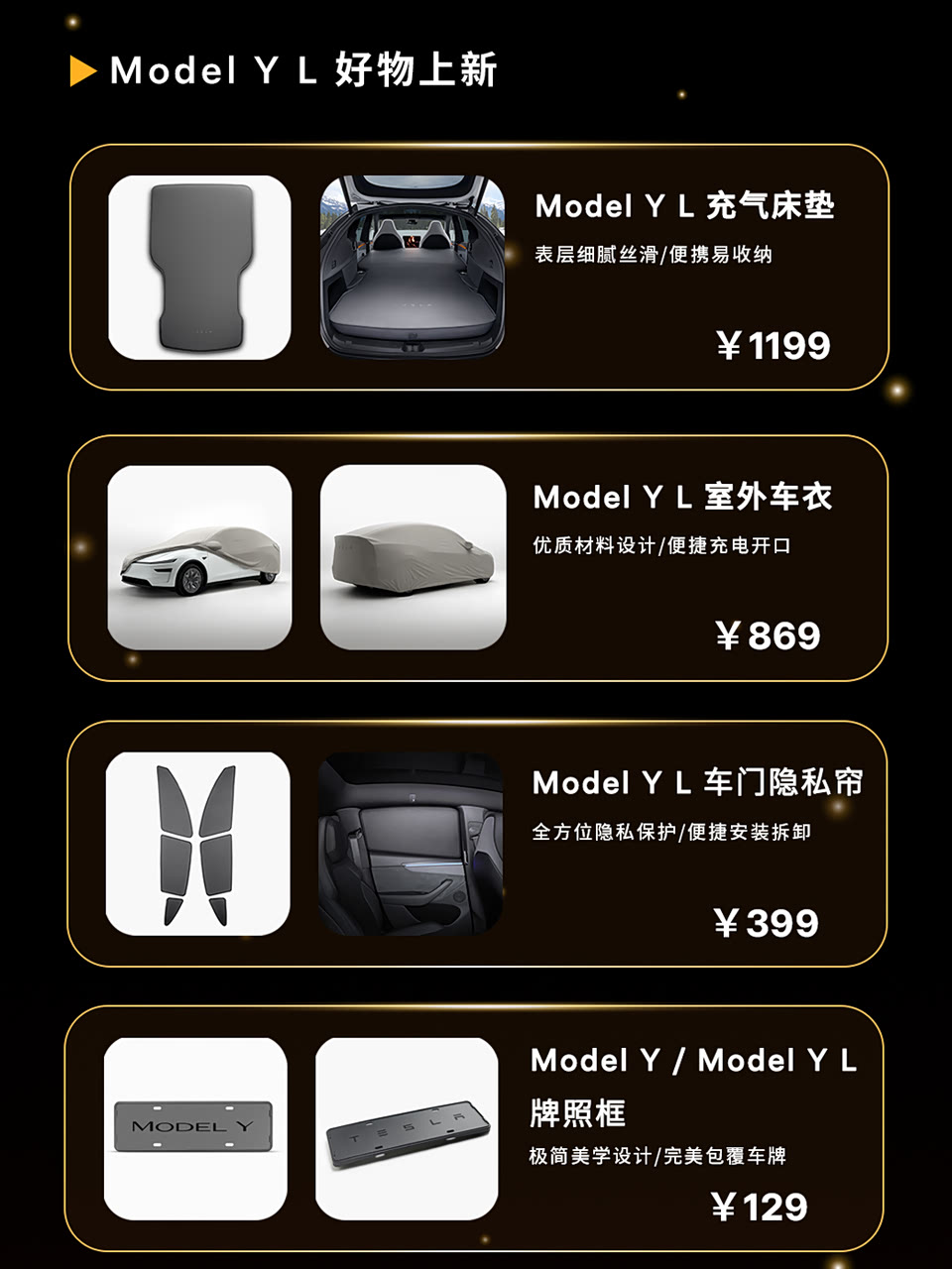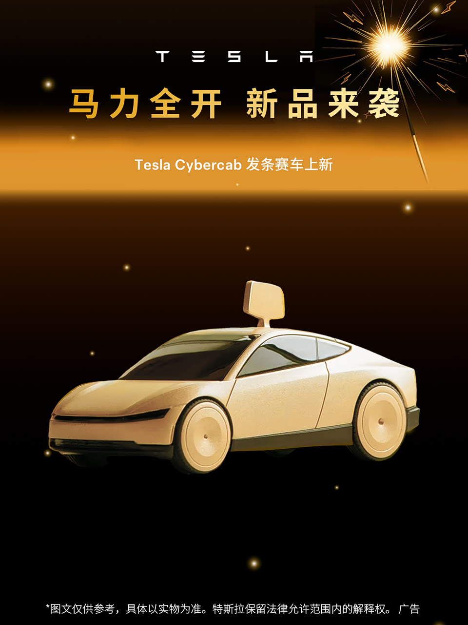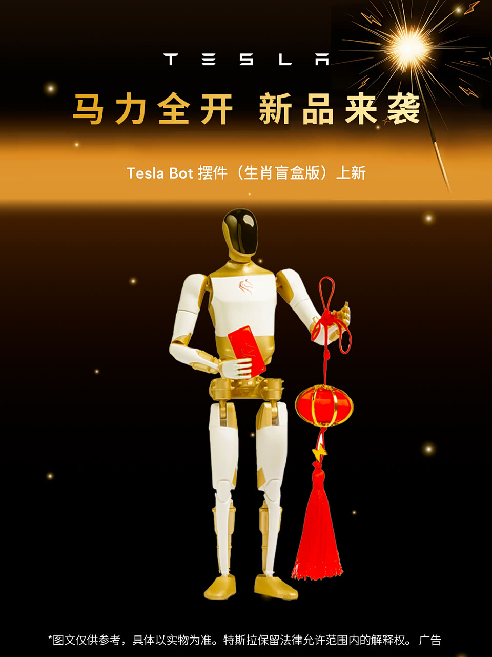 🤖Tesla Bot摆件(生肖盲盒版) 焕新造型上线,隐藏款惊喜登场,开盒即是好运 🚗Tesla Cybercab发条赛车 复古发条结构,金色车身质感拉满 转动之间重拾童年快乐 🛏️ Model Y L车载精选 充气床垫、室外车衣、车门隐私帘 牌照框、双层中控台托盘、座椅下储物盒 极简美学设计,为爱车增添更多实用“新装备”🆕 1月21日上午10点准时开售⏰ 马上登录特斯拉在线商店 挑选你的新年特别好物!