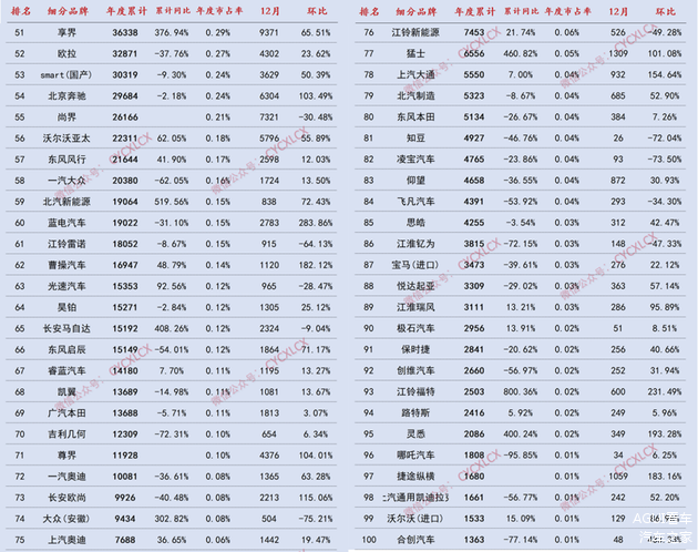 比亚迪以303.97万辆的年度累计销量稳居榜首,尽管同比下滑12.90%,但依旧展现出难以撼动的统治力。吉利银河以97.67万辆的销量位列第二,同比暴涨295.74%,凭借 星愿、熊猫MINI等车型精准击中品质消费需求,成为高端新能源赛道的最大黑马。