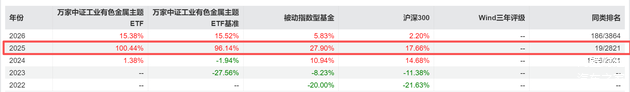 工业有色ETF万家(560860)长期业绩优秀,2025年该ETF上涨100.44%!较同期基准获4.3%的超额收益,在2821只被动指数基金中,排名19/2821。