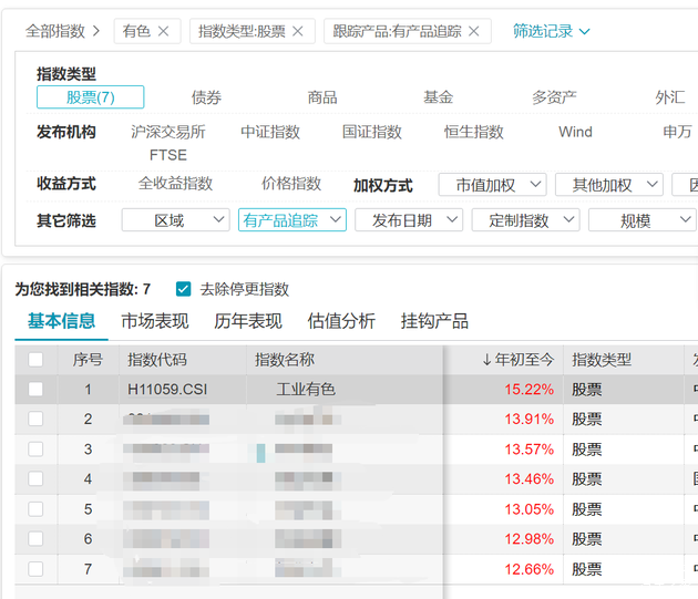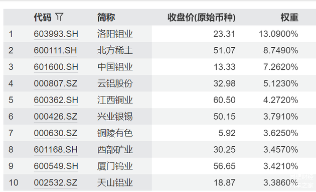 该指数前三大金属行业为铜(29.2%)、铝(26.7%)、稀土(15.3%),合计占比近70%,相对有色金属指数,工业有色不含新能源锂,黄金占比(6%)较小。前十大成分股涵盖洛阳钼业、北方稀土、中国铝业、江西铜业等行业龙头。