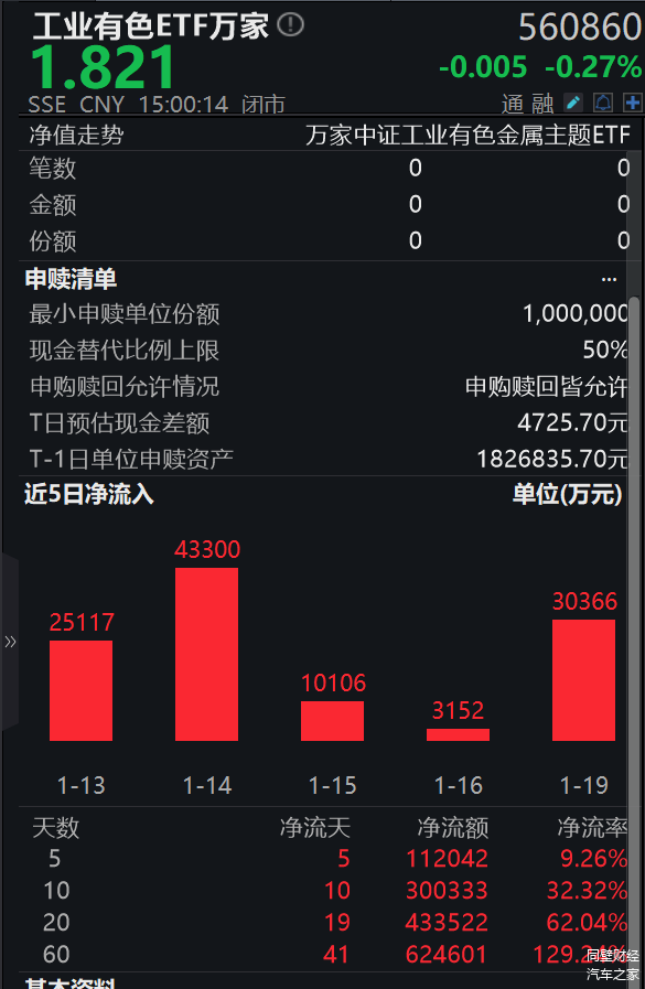工业有色ETF万家(560860)——投资工业制造所需的金属原材料,连续两日小幅调整,昨日收跌0.49%,今日收跌0.27%。资金不改加仓态势,昨日工业有色ETF万家(560860)获3亿元资金逆势净流入;近10个交易日,该ETF获得资金连续净流入,合计30亿元;近60日合计流入超62亿元。最新规模增至135.11亿元,为当前全市场首只且唯一跟踪中证工业有色金属主题指数的场内ETF产品。