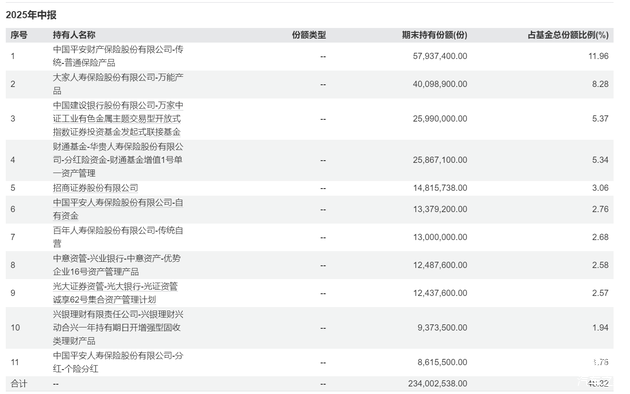 工业有色ETF万家(560860)深受机构投资者青睐,2025年中报最新数据显示,该ETF机构投资者从2024年末的41%升至近60%,只隔了半年时间;前十大持有人合计占比超48%,其中6位都是险资机构,包含普通保险、万能险、分红险及险资自有资金,彰显险资长钱对工业有色金属板块在经济复苏周期景气度回升的持续看好,此外还有券商、资管、银行理财子公司等机构。