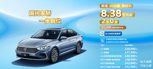 日前,我们从上汽大众官方获悉,2026款 大众朗逸正式上市,官方指导价12.09万-15.19万元,限时价8.38万元起。作为年度改款车型,2026款大众朗逸主要针对功能配置进行优化调整,继续提供两种动力选项。