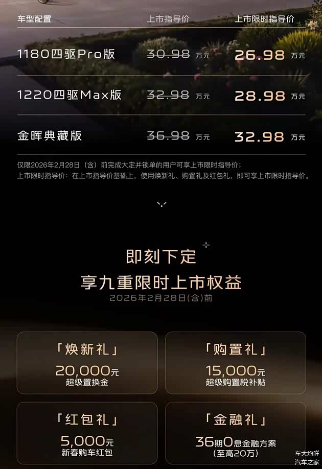 1月20日,吉利 银河V900正式上市,共推出3款配置车型,官方指导价30.98万-36.98万元,限时26.98万-32.98万元(该价格已含20000元超级置换金、15000元超级购置税补贴以及5000元购车红包)。吉利银河V900可以视为在售翼真L380的增程动力版本,全系标配1.5T增程+双电机四驱的动力系统,具备高阶辅助驾驶能力。