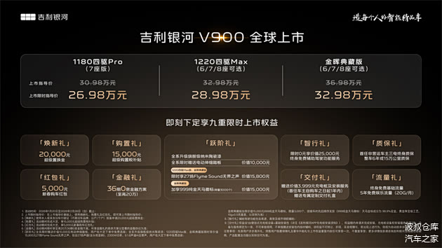 1月20日,吉利银河豪华V系列首发之作,“AI全场景家庭旗舰MPV”——吉利 银河V900正式上市,共推出3个车型,上市限时指导价26.98万元-32.98万元。
