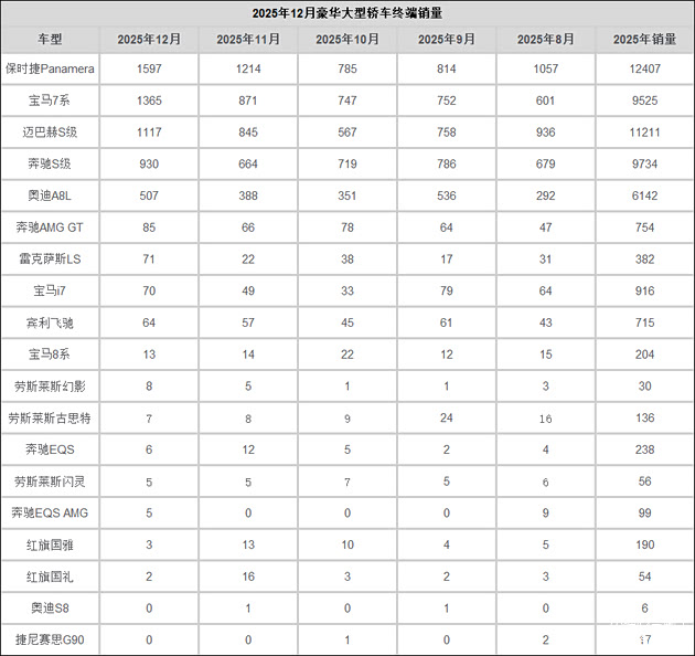 在2025年12月,保时捷Panamera表现更优,终端销量1597辆,全年销量1240辆,以月均销量超过1000辆的成绩,成为年度豪华大型车销量冠军,但相比其巅峰时期要逊色不少,毕竟这一并不算出色的成绩是靠降价促销换来的。同样来自大众集团的奥迪A8L,12月销量507辆,全年销量6142辆,虽然谈不上非常出色,但也算是走势稳定。宾利飞驰的12月终端销量64辆,全年总销量715辆。虽然头顶宾利光环,但其在高端客户群中的认可度并不一定高于 迈巴赫S级的高端车型。