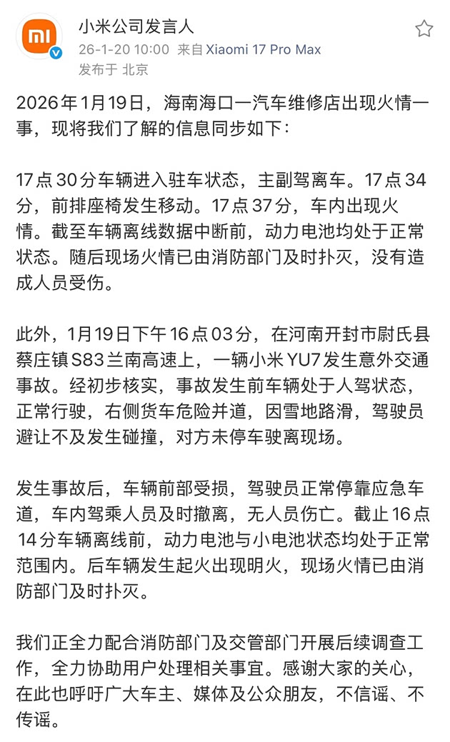 事情是这样的,1月19日,一辆小米YU7在海南海口某维修店内着火。而得益于店内的摄像头,以及车辆的上报信息,还原了最真实的信息流: