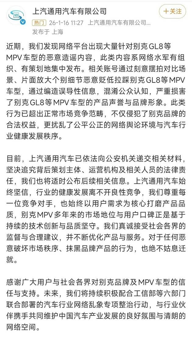 然而戏剧性的事情发生了,就在上周五,上汽通用汽车官方账号突然发布一条消息称:网络平台出现大量针对别克GL8等MPV车型的恶意造谣内容。这些账号通过刻意摆拍对比场景,片面放大个别细节,恶意贬低拉踩。损害别克GL8等MPV车型的产品声誉和品牌形象。