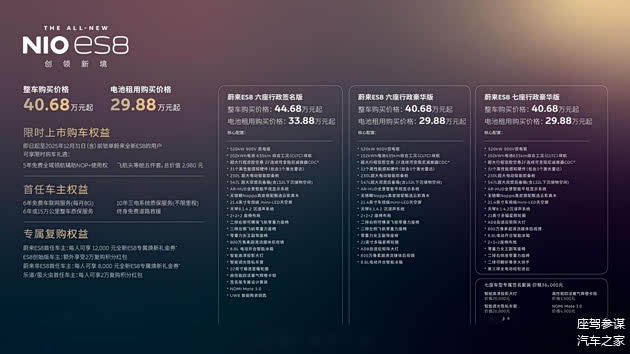 全新ES8的定价策略非常聪明,六座版起售价40.68万元,比以前便宜不少。更猛的是,电池租赁方案下探至29.88万元,比旧款降价超8万元。